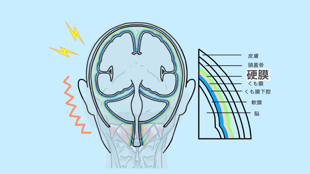 緊張型頭痛の場合、一つの要因として後頭部にある筋肉の緊張が発端となり、頭蓋骨の下にある膜を伝い頭痛を起こします。
