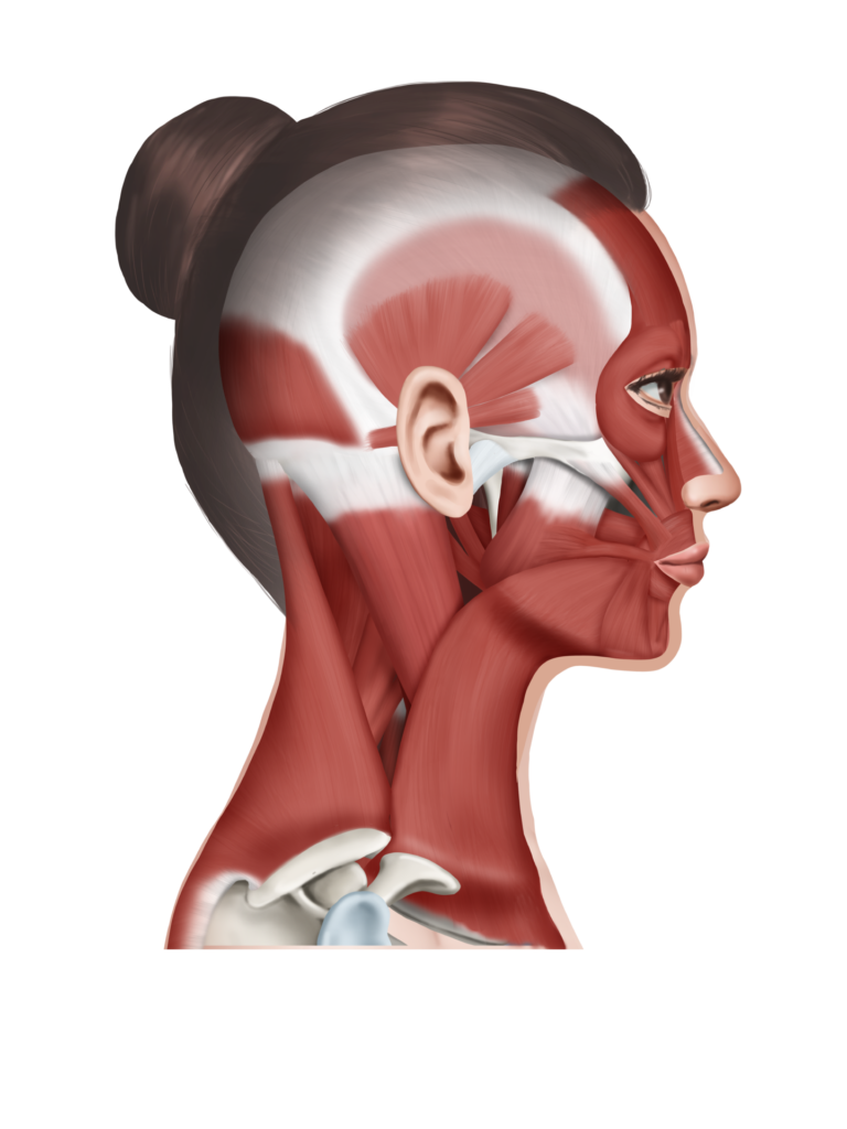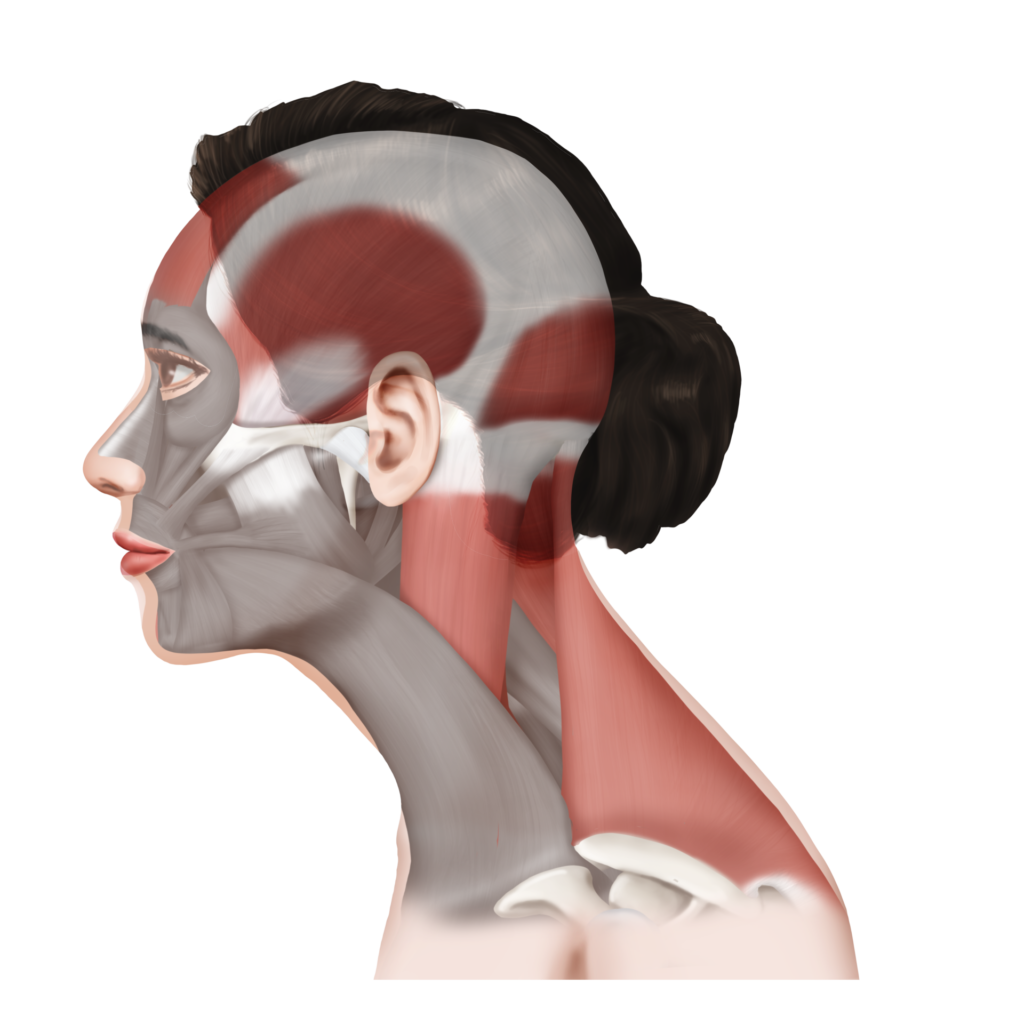 首と頭が前にでる、所謂ストレートネック、といわれる体勢の時に後頭部の筋肉は縮み続け、緊張状態となります。